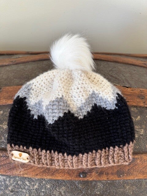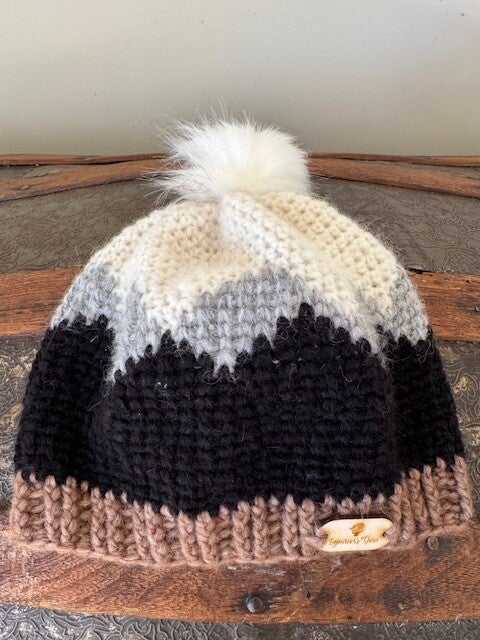 Featured colors: Maple Sugar, Black, Soft Gray and Whipped Cream topped with a white faux fur pom-pom.